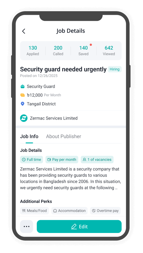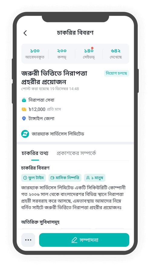 পরিষ্কারভাবে দেওয়া বেনিফিট ট্যাগগুলো চাকরির বিবরণকে সহজ করে তোলে, আর নির্ধারিত কল টাইম থাকায় নিয়োগ প্রক্রিয়া দ্রুত হয়!
